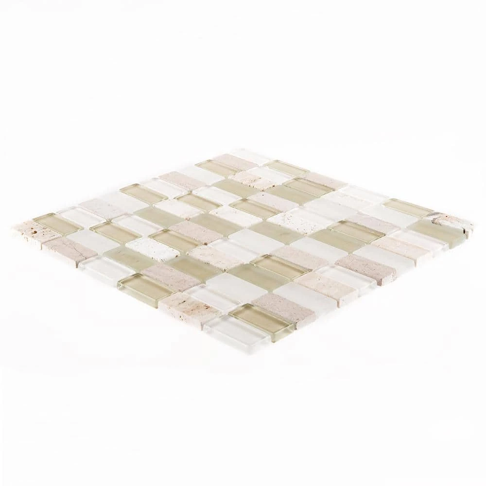Show off your unique design style with Cottage Ridge 11-5/8 in. x 11-5/8 in. Glass and Stone Mosaic Tile. This glass and travertine stone mosaic features mini rectangular pieces that create a brick pattern. Its assorted white, cream and tan color shades create the perfect neutral color palette. Combine with other mosaics and field tiles to create impressive installations. For best installation results, use white polymer-modified thinset.