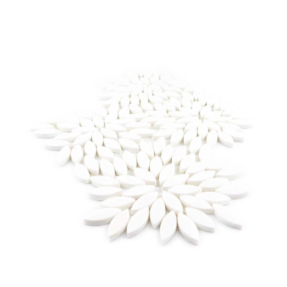 Let your style bloom with our Tea Party White mosaic. This fun mosaic features Thassos marble cut into a petal pattern to create a delicate and fresh look in your home. The natural stone comes in a honed finish and has a slight sparkle that occurs naturally. The Thassos marble features minimal veining for a clean look. Perfect for creating stunning large installations or in combination with other mosaic and field tiles for intricate designs.