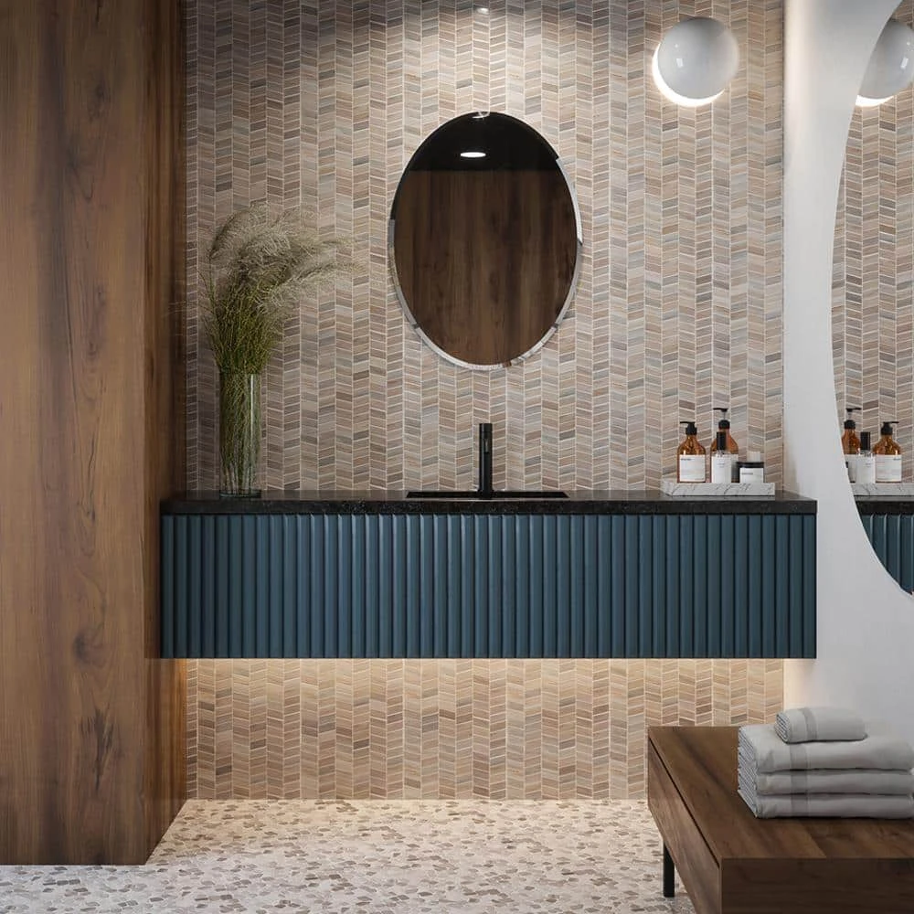 Create a timeless look in your kitchen or bathroom with our Weekender 10-1/8 in. x 12-1/8 in. Natural Stone Mosaic. This cream and beige marble mosaic features soft natural veining that adds dimension while its polished finish makes it shine. The chevron pattern is perfect for classic and modern styles. Combine with other mosaics and field tiles to create impressive installations. For best installation results, use white polymer-modified thinset.